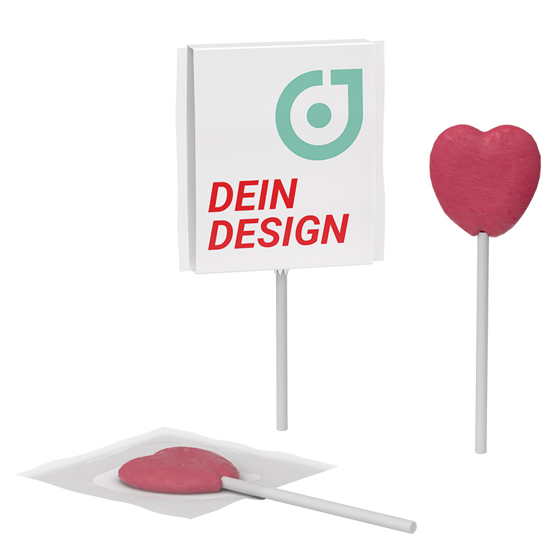 Der vegane, herzförmige Werbe-Lolly mit Kirschgeschmack ist die perfekte kleine Aufmerksamkeit für Messen, Events oder als Give-away. Verpackt in einer hochwertigen, quadratischen Werbebanderole aus weißem FSC®-zertifizierten Karton, wird der Herz-Lolly vom süßen Snack zu einem echten Markenbotschafter. Die individuell bedruckbare Papierbanderole sorgt für eine hohe Sichtbarkeit deiner Werbebotschaft und überzeugt durch einen niedrigen Kontaktpreis. Für maximale Flexibilität stehen zwei Varianten zur Verfügung: mit Sichtfenster und dekorativer Herzstanzung oder als geschlossene Version mit zusätzlicher Werbefläche.