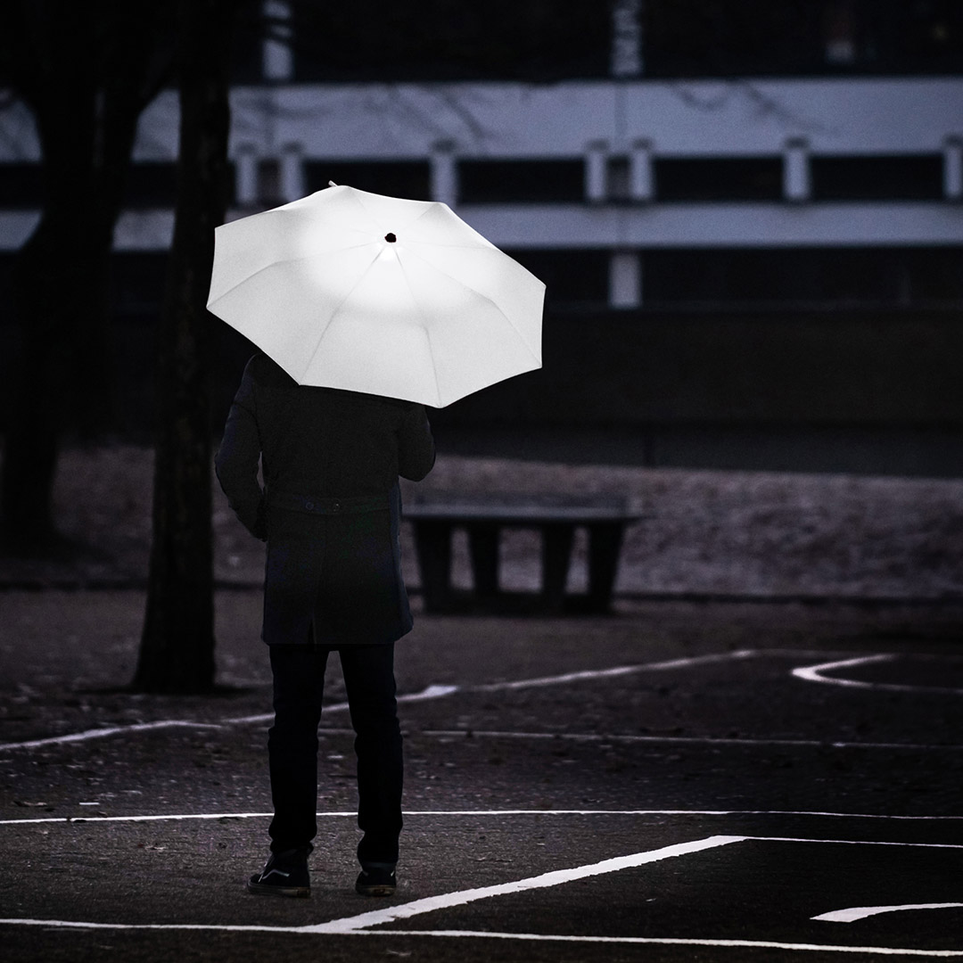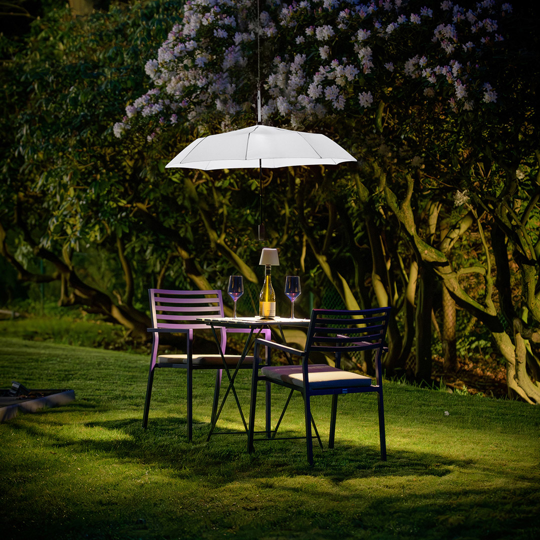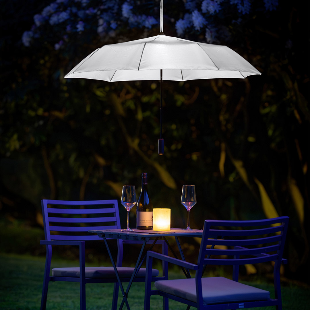 Effektvoller Taschenschirm mit LED-Innenbeleuchtung und Aufhängefunktion