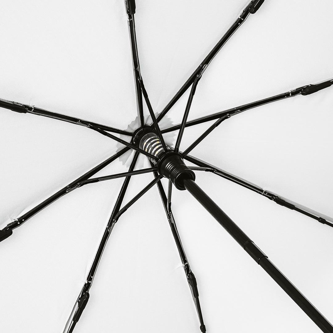 Es werde Licht! Beim Taschenschirm FARE® Skylight lässt sich die LED-Innenbeleuchtung einfach an- und auch wieder ausschalten. Das ist ganz schön praktisch, wenn man z.B. spät abends auf dem Parkplatz nach dem Autoschlüssel sucht oder in dunklen Stunden noch eine Runde spazieren möchte. Gerade im Herbst und Winter gehört dieser kompakte Schirm, gerüstet auch für stärkere Windböen, also immer in die Tasche oder ins Reisegepäck. Oder man nimmt es lässig und lässt den Schirm an der Trageschlaufe am Handgelenk baumeln.